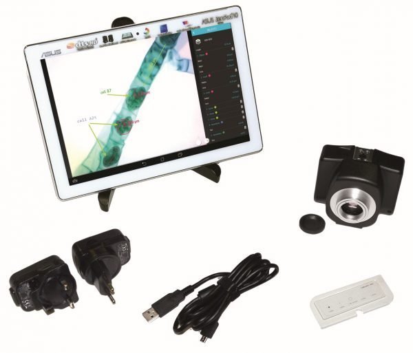 Chỉ cần gắn camera lên kính hiển vi và mở ứng dụng đã được cài sẵn trên máy tính bảng để bắt đầu thu thập hình ảnh mẫu quan sát. Sau khi thu thập, hình ảnh có thể được xử lý với nhiều chức năng: tạo báo cáo, đo lường, đếm tế bào, điều chỉnh màu sắc/độ tương phản, v.v. Nhiều máy tính bảng có thể cùng xem một hình ảnh từ một kính hiển vi kết nối, lý tưởng cho lớp học hoặc kiểm tra chất lượng – không cần kết nối kính hiển vi với PC.
